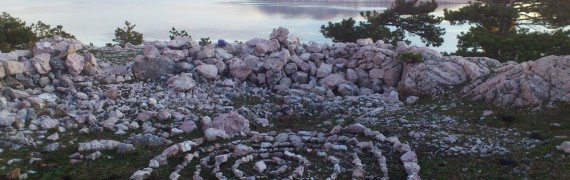 Treći labirint ljubavi i stvaralaštva nastao je u siječnju 2012., na otoku Krku, kod Baške, na vrhu brda iznad crkve Sv. Ivana. Izgradili smo ga prijatelj Mišel i ja, spontano i na brzinu, bez puno planiranja i promišljanja, također pred sam zalazak Sunca. On je malenih dimenzija, oko 2 metra u promjeru, može se proći ako ste malo spretniji pa se krećeta na prstima 🙂